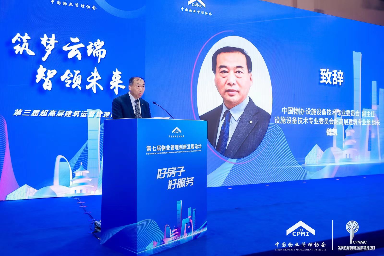 中國物業(yè)管理協(xié)會設(shè)施設(shè)備技術(shù)專業(yè)委員會副主任、設(shè)施設(shè)備技術(shù)專業(yè)委員會超高層建筑專業(yè)組組長、國貿(mào)物業(yè)高級顧問魏凱在論壇上致辭。